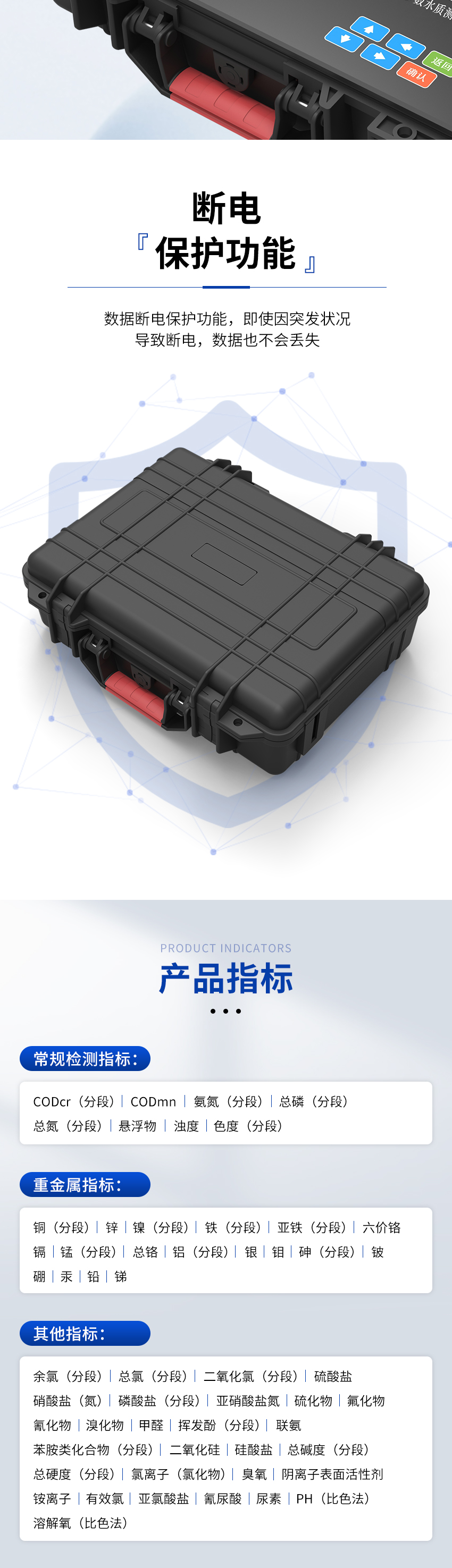 序號 測定項目 測定范圍 單位 誤差 1 COD(鉻法 低量程) 5-200或5-150 mg/L 5% 2 COD(鉻法 高量程) 200-2000或150-2000 mg/L 5% 3 氨氮(低量程) 0.02-5.00 mg/L 3%(F.S) 氨氮(高量程) 5.00-25.00 mg/L 3%(F.S) 4 總磷(低量程) 0.02-2.00 mg/L 5%(F.S) 總磷(高量程) 2.00-10.00 mg/L 5%(F.S) 5 總氮(低量程) 0.10-10 mg/L 5%(F.S) 總氮(高量程) 10-100 mg/L 5%(F.S) 6 CODMn(高錳酸鹽指數) 0.00-10.00 mg/L 0.2或5% 7 余氯(低量程) 0.02-2.00 mg/L 0.1或5% 余氯(高量程) 2.00-10.00 mg/L 5% 8 總氯(低量程) 0.02-2.00 mg/L 0.1或5% 總氯(高量程) 2.00-10.00 mg/L 5% 9 二氧化氯(低量程) 0.05-2.00 mg/L 0.2或5% 二氧化氯(高量程) 2.00-20.00 mg/L 5% 10 硫酸鹽 5-200 mg/L 5% 11 硝酸鹽(氮) 0.02-10.0 mg/L 0.1或5% 12 磷酸鹽(低量程) 0.01-10.0 mg/L 0.2或5% 磷酸鹽(高量程) 10.0-50.0 mg/L 5% 13 亞硝酸鹽氮(低) 0.02-1.0 mg/L 0.05或5% 亞硝酸鹽氮(高) 1.0-5.0 mg/L 5% 14 硫化物 0.005-1.000 mg/L 5%(F.S) 15 氟化物 0.05-2.0 mg/L 5%(F.S) 16 氰化物 0.01-0.50 mg/L 5%(F.S) 17 溴化物 0.10-5.00 mg/L 5%(F.S) 18 甲醛 0.05-2.5 mg/L 5%(F.S) 19 揮發酚(低) 0.20-5.0 mg/L 5%(F.S) 揮發酚(高) 5.0-10.0 mg/L 5%(F.S) 20 聯氨 0.01-0.50 mg/L 5%(F.S) 21 苯胺類化合物(低) 0.03-1.0 mg/L 5%(F.S) 苯胺類化合物(高) 1.0-5.0 mg/L 5%(F.S) 22 二氧化硅 0.01-5.00 mg/L 5%(F.S) 23 硅酸鹽 0.01-5.00 mg/L 5%(F.S) 24 總堿度(低) 0-100 mg/L 5%(F.S) 總堿度(高) 100-1000 mg/L 5%(F.S) 25 總硬度(低) 0.1-5.0 mg/L 5%(F.S) 總硬度(中) 5.0-50.0 mg/L 5%(F.S) 總硬度(高) 50.0-500.0 mg/L 5%(F.S) 26 氯離子(氯化物) 0.20-100.0 mg/L 5%(F.S) 27 臭氧 0.01-2.5 mg/L 5%(F.S) 28 陰離子表面活性劑 0.01-1.0 mg/L 5%(F.S) 29 銨離子 0.02-25.00 mg/L 5%(F.S) 30 有效氯 0.0-100.0 mg/L 5%(F.S) 31 亞氯酸鹽 0.00-20.00 mg/L 5%(F.S) 32 氰尿酸 0-200 mg/L 5%(F.S) 33 尿素 0.00-4.00 mg/L 5%(F.S) 34 銅(低) 0.02-1.0 mg/L 5%(F.S) 銅(高) 1.0-10.0 mg/L 5%(F.S) 35 鋅 0.2-5.0 mg/L 5%(F.S) 36 鎳(低) 0.02-0.50 mg/L 5%(F.S) 鎳(高) 0.50-1.00 mg/L 5%(F.S) 37 鎳 0.02-10.0 mg/L 5%(F.S) 38 鐵(低) 0.0-5.0 mg/L 5%(F.S) 鐵(高) 5.0-10.0 mg/L 5%(F.S) 39 亞鐵(低) 0.0-5.0 mg/L 5%(F.S) 亞鐵(高) 5.0-10.0 mg/L 5%(F.S) 40 六價鉻 0.01-1.00 mg/L 5%(F.S) 41 鎘 0.05-0.50 mg/L 5%(F.S) 42 錳(低) 0.01-0.10 mg/L 5%(F.S) 錳(高) 0.10-1.0 mg/L 5%(F.S) 43 錳 0.02-5.00 mg/L 5%(F.S) 44 總鉻 0.02-1.0 mg/L 5%(F.S) 45 鋁(低) 0.01-0.40 mg/L 5%(F.S) 鋁(高) 0.40-4.00 mg/L 5%(F.S) 46 銀 0.01-1.00 mg/L 5%(F.S) 47 鉬 0.05-1.00 mg/L 5%(F.S) 48 砷(低) 0.004-0.100 mg/L 5%(F.S) 砷(高) 0.100-0.500 mg/L 5%(F.S) 49 鈹 0.001-0.10 mg/L 5%(F.S) 50 硼 0.10-2.00 mg/L 5%(F.S) 51 汞 0.002-0.50 mg/L 5%(F.S) 52 鉛 0.01-0.50 mg/L 5%(F.S) 53 銻 0.05-10.0 mg/L 5%(F.S) 54 色度(低量程) 5-50 PCU 3%(F.S) 色度(高量程) 50-500 PCU 3%(F.S) 55 濁度 0-400 NTU ≤2%(F.S) 56 懸浮物 5-1000 mg/L ≤2%(F.S) 57 PH(比色法) 5.00-8.00 PH 0.1±0.1 58 PH(電極法) 0.00-14.00 PH ±0.1 59 溶解氧(比色法) 0.1-10.0 mg/L 0.1±5% 60 溶解氧(電極法) 0-20.0 mg/L ±0.2 61 電導率(電極法) 0.00μs/cm-199.9ms/cm ms/cm 1.0% (F.S) 62 TDS(電極法) 0.0mg/L~199.9 g/L ±0.5% (F.S) 63 鹽度(電極法) 0-50000 mg/L ±1.0% (F.S) 三、產品特點