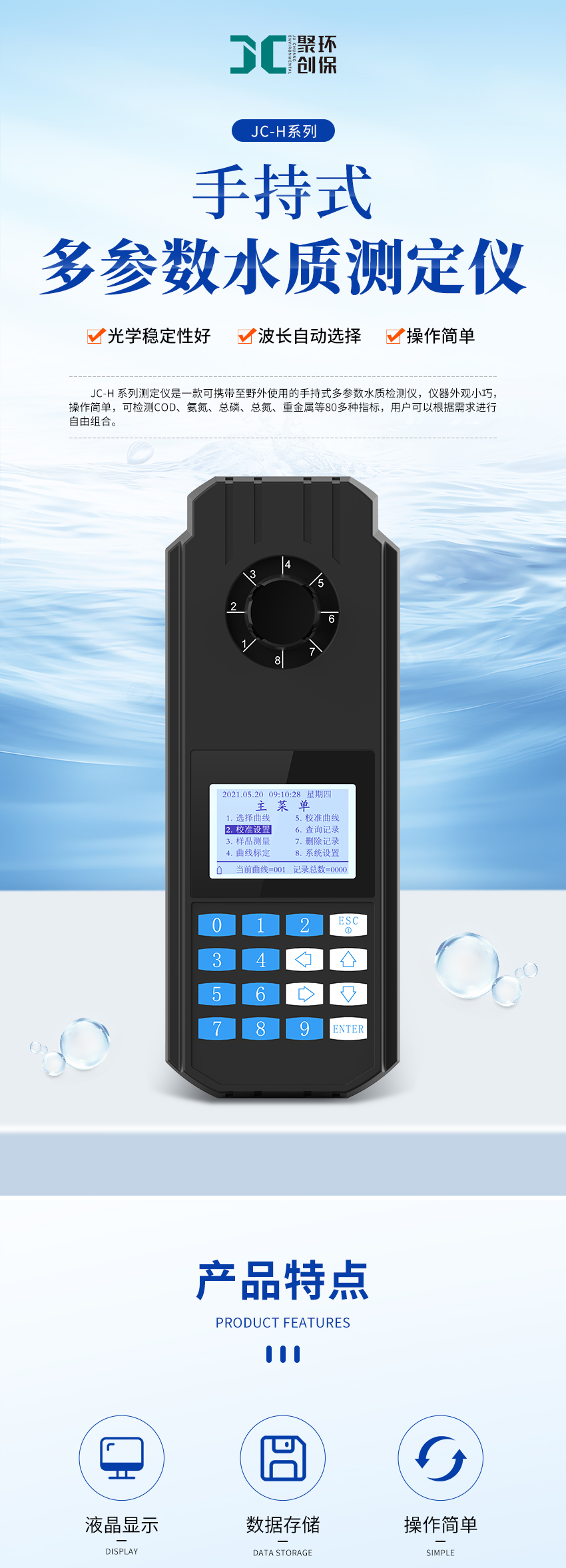 JC-H系列手持式多參數水質測定儀,用戶可以根據需要進行自由的組合。廣泛適用于飲用水、地表水、地面水及污水的測定。
