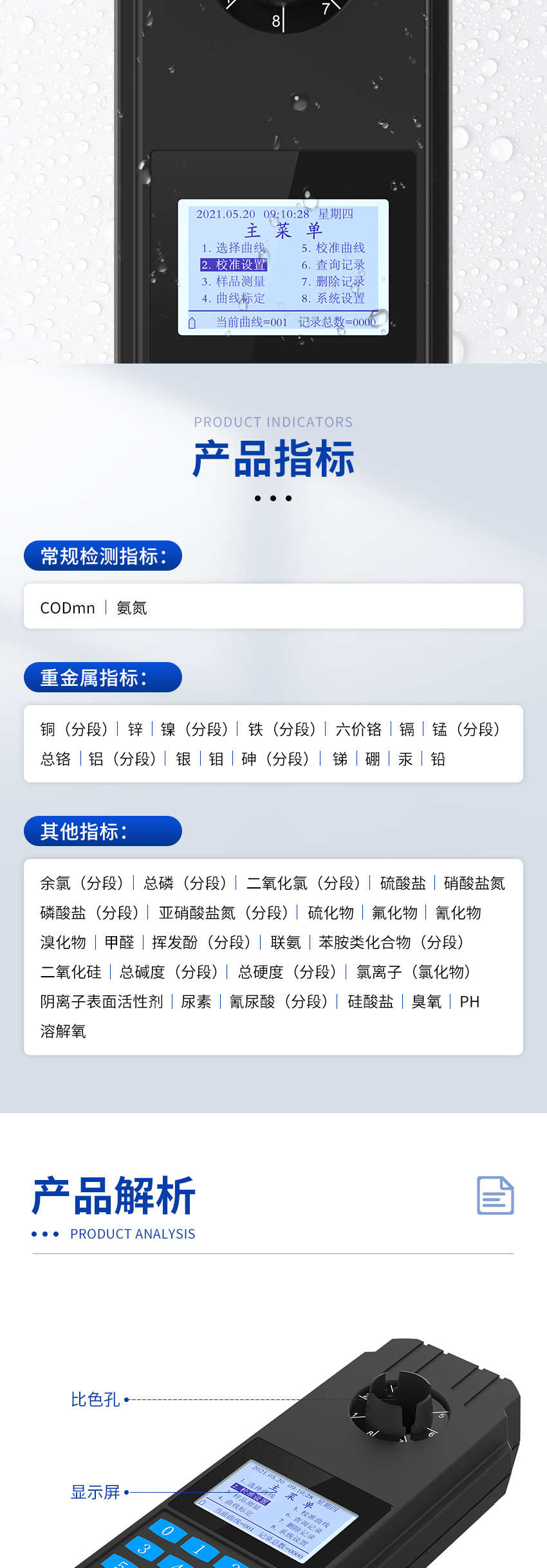 序號 測定項目 測定范圍 單位 誤差 1 COD(錳法) 0.00-10.00 mg/L 0.2或5% 2 氨氮 0.00-25.00 mg/L 0.2或5% 3 余氯(低量程) 0.02-2.00 mg/L 0.1或5% 4 余氯(高量程) 2.00-10.00 mg/L 5% 5 總氯(低量程) 0.02-2.00 mg/L 0.1或5% 6 總氯(高量程) 2.00-10.00 mg/L 5% 7 二氧化氯(低量程) 0.05-2.00 mg/L 0.2或5% 8 二氧化氯(高量程) 2.00-20.00 mg/L 5% 9 硫酸鹽 5-200 mg/L 5% 10 硝酸鹽氮 0.02-10.0 mg/L 0.1或5% 11 磷酸鹽(低量程) 0.01-10.0 mg/L 0.2或5% 12 磷酸鹽(高量程) 10.0-50.0 mg/L 5% 13 亞硝酸鹽氮(低) 0.02-1.0 mg/L 0.05或5% 14 亞硝酸鹽氮(高) 1.0-5.0 mg/L 5% 15 硫化物 0.005-1.000 mg/L 5%(F.S) 16 氟化物 0.05-2.0 mg/L 5%(F.S) 17 氰化物 0.01-0.50 mg/L 5%(F.S) 18 溴化物 0.10-5.00 mg/L 5%(F.S) 19 甲醛 0.05-2.5 mg/L 5%(F.S) 20 揮發酚(低) 0.20-5.0 mg/L 5%(F.S) 21 揮發酚(高) 5.0-10.0 mg/L 5%(F.S) 22 聯氨 0.01-0.50 mg/L 5%(F.S) 23 苯胺類化合物(低) 0.03-1.0 mg/L 5%(F.S) 24 苯胺類化合物(高) 1.0-5.0 mg/L 5%(F.S) 25 二氧化硅 0.01-5.00 mg/L 5%(F.S) 26 總堿度(低) 0-100 mg/L 5%(F.S) 27 總堿度(高) 100-1000 mg/L 5%(F.S) 28 總硬度(低) 0.1-5.0 mg/L 5%(F.S) 29 總硬度(中) 5.0-50.0 mg/L 5%(F.S) 總硬度(高) 50.0-500.0 mg/L 5%(F.S) 30 氯離子/氯化物 0.20-100.0 mg/L 5%(F.S) 31 銅(低) 0.02-1.0 mg/L 5%(F.S) 32 銅(高) 1.0-10.0 mg/L 5%(F.S) 33 鋅 0.2-5.0 mg/L 5%(F.S) 34 鎳(低) 0.02-0.50 mg/L 5%(F.S) 35 鎳(高) 0.50-1.00 mg/L 5%(F.S) 36 鎳 0.02-10.0 mg/L 5%(F.S) 37 鐵(低) 0.0-5.0 mg/L 5%(F.S) 38 鐵(高) 5.0-10.0 mg/L 5%(F.S) 39 六價鉻 0.01-1.00 mg/L 5%(F.S) 40 鎘 0.05-0.50 mg/L 5%(F.S) 41 錳(低) 0.01-0.10 mg/L 5%(F.S) 42 錳(高) 0.10-1.0 mg/L 5%(F.S) 43 錳 0.02-5.00 mg/L 5%(F.S) 44 總鉻(需配消解儀) 0.02-1.0 mg/L 5%(F.S) 45 鋁(低) 0.01-0.40 mg/L 5%(F.S) 46 鋁(高) 0.40-4.00 mg/L 5%(F.S) 47 銀 0.01-1.00 mg/L 5%(F.S) 48 鉬 0.05-1.00 mg/L 5%(F.S) 49 砷(低) 0.004-0.100 mg/L 5%(F.S) 50 砷(高) 0.100-0.500 mg/L 5%(F.S) 51 銻 0.5-10.0 mg/L 5%(F.S) 52 硼 0.10-2.00 mg/L 5%(F.S) 53 汞 0.002-0.50 mg/L 5%(F.S) 54 鉛 0.01-0.50 mg/L 5%(F.S) 55 PH 5.00-8.00 PH 0.1±0.1 56 溶解氧 0.1-10.0 mg/L 0.1±5% 57 臭氧 0.01-2.5 mg/L 5%(F.S) 58 陰離子表面活性劑 0.01-1.0 mg/L 5%(F.S) 59 尿素 0.10-4 mg/L 5%(F.S) 60 氰尿酸低 0~100mg/L mg/L 5%(F.S) 61 氰尿酸高 100~200mg/L mg/L 5%(F.S) 62 硅酸鹽 0.01-6.00 mg/L 5%(F.S)