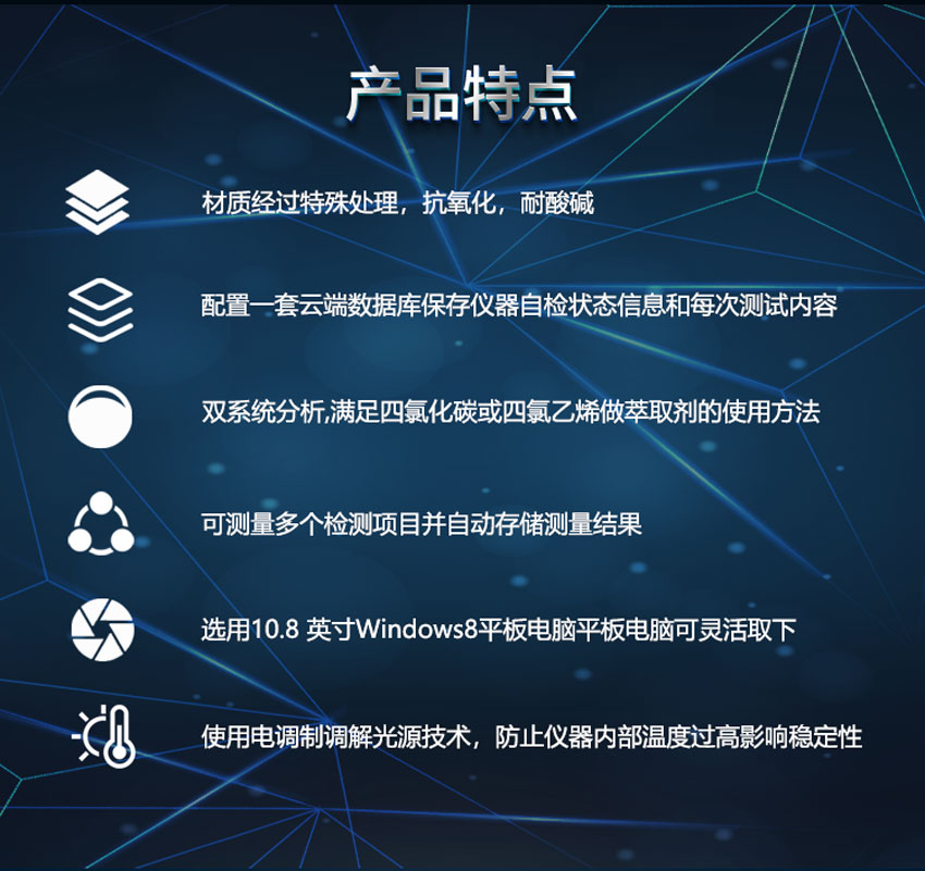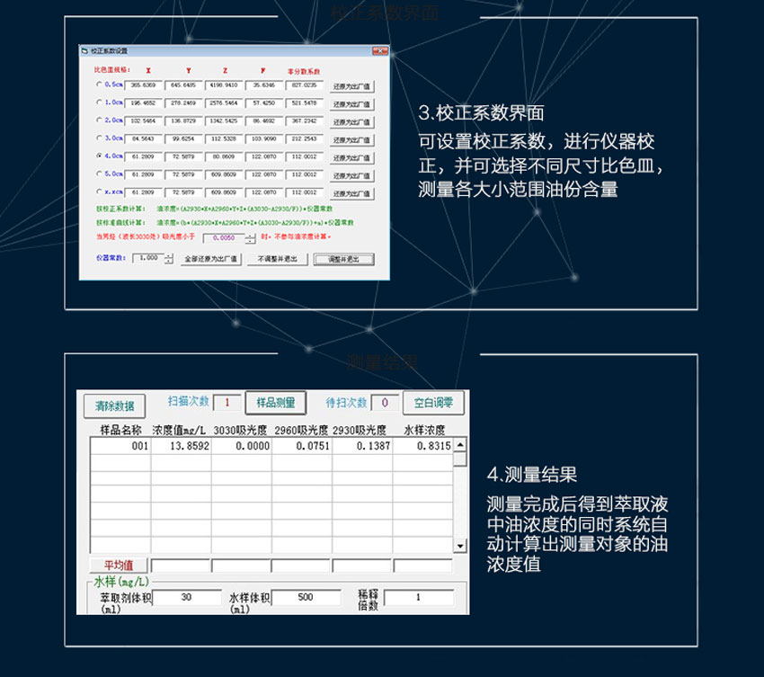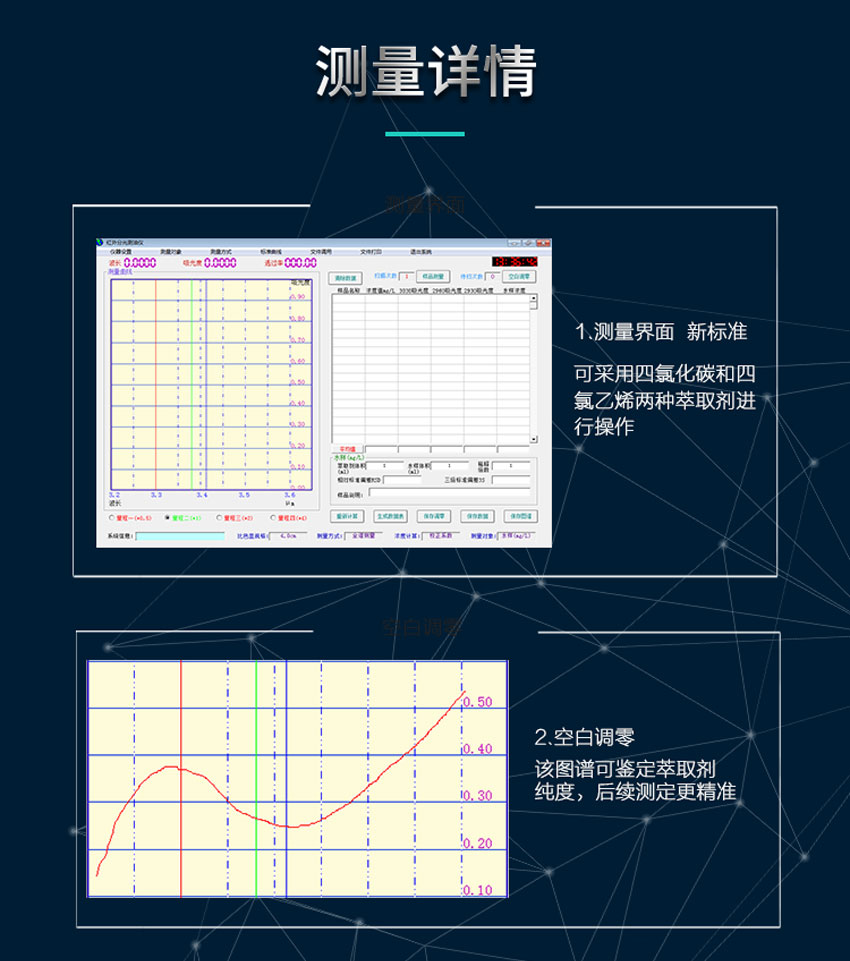 8、軟件系統(tǒng):采用雙系統(tǒng)分析,分別滿足四氯化碳或四氯乙烯做萃取劑的使用方法。