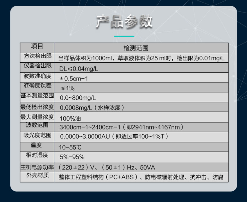 方法檢出限 當樣品體積為1000ml,萃取液體積為25ml時,檢出限為0.01mg/L 儀器檢出限 DL≤0.04mg/L(四氯化碳空白液測定11次的3倍SD) 波數(shù)準確度 ±0.5cm-1 采用自動定位校準,30mg/L以上油樣自動對2930cm-1、2960cm-1、3030cm-1處校準,消除了人為定位的影響 重復(fù)性 30~40mg/L油標樣測定11次 RSD≤0.6%或0.5mg/L水樣RSD≤5% 儀器光學(xué)系統(tǒng)、電氣系統(tǒng)自成一體,集成化程度高,從而提高了儀器的可靠性和重復(fù)性 準確度誤差 ≤1% 校正系數(shù)準確度 用四氯化碳做參比溶液,使用4cm比色皿,分別測量2mg/L、5mg/L、20mg/L、50mg/L、100mg/L石油類標準液,誤差±10% 掃描速度 全譜掃描,30秒鐘/次 非分散紅外法2秒鐘 基本測量范圍 0.0~800mg/L 至低檢出濃度 0.0008mg/L(水樣濃度) MAX測量濃度 100%油 線性相關(guān)系數(shù) r﹥0.999 波數(shù)范圍 3400cm-1~2400cm-1(即2941nm~4167nm) 吸光度范圍 0.0000~ 3.0000AU(即透過率100~ 1%T) 溫度 10-55℃ 相對濕度 5%-95% 主機電源功率 (220±22)V、(50±1)Hz、50VA 外殼材質(zhì) 整體工程塑料結(jié)構(gòu)(PC+ABS)、防電磁輻射處理、抗沖擊、防腐