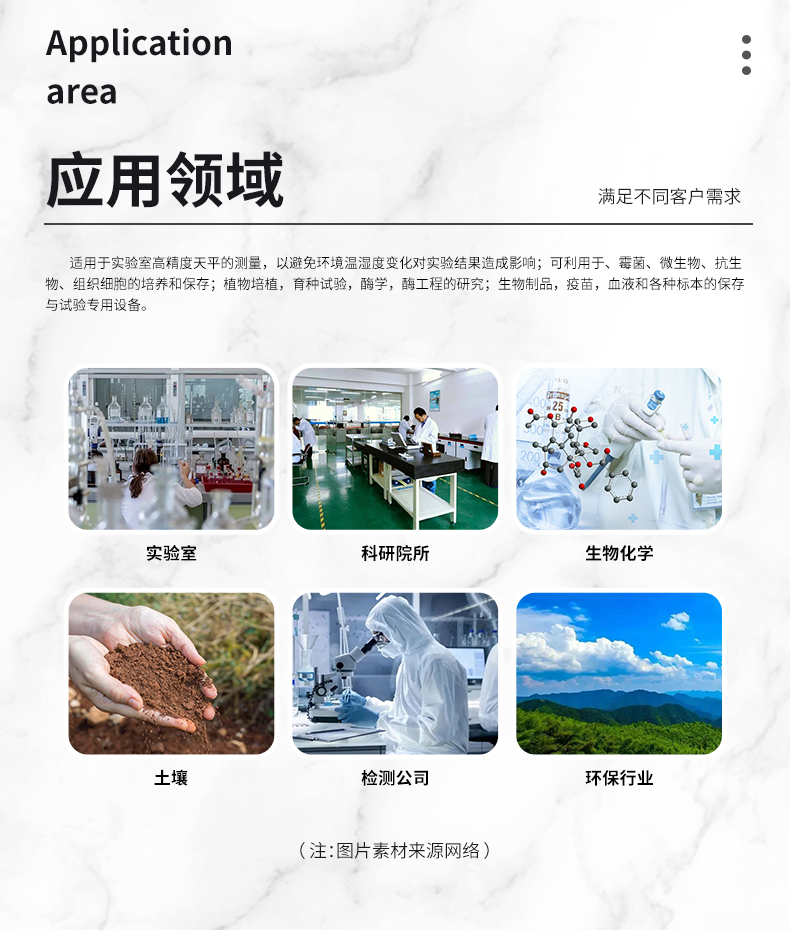 適用于實驗室高精度天平的測量,以避免環境溫濕度變化對實驗結果造成影響;可利用于、霉菌、微生物、抗生物、組織細胞的培養和保存;植物培植,育種試驗,酶學,酶工程的研究;生物制品,疫苗,血液和各種標本的保存與試驗專用設備。