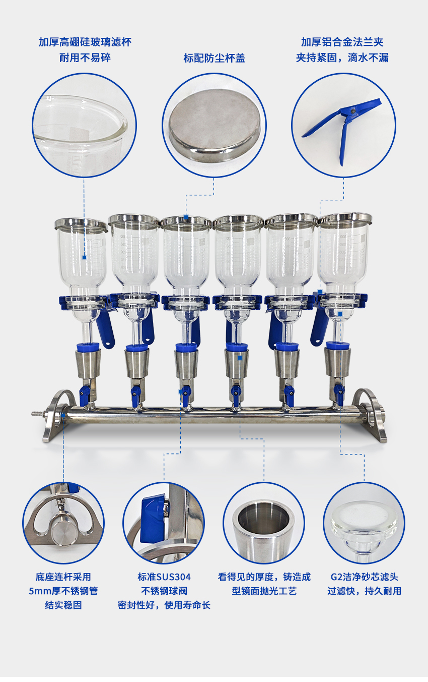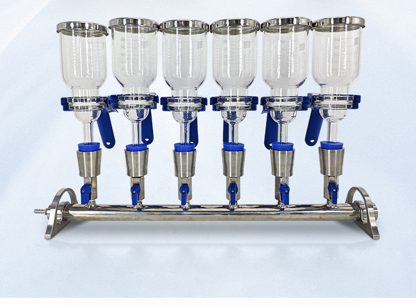 4. 靈活多樣的過濾頭選擇:過濾頭有單聯及多聯(二聯、三聯、四聯、六聯或其他聯數定制)可選。多聯可同時抽濾,提升工作效率;每個濾頭又能獨立控制,方便操作人員靈活運用。