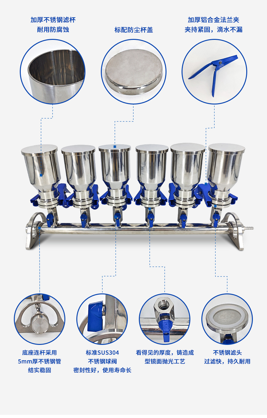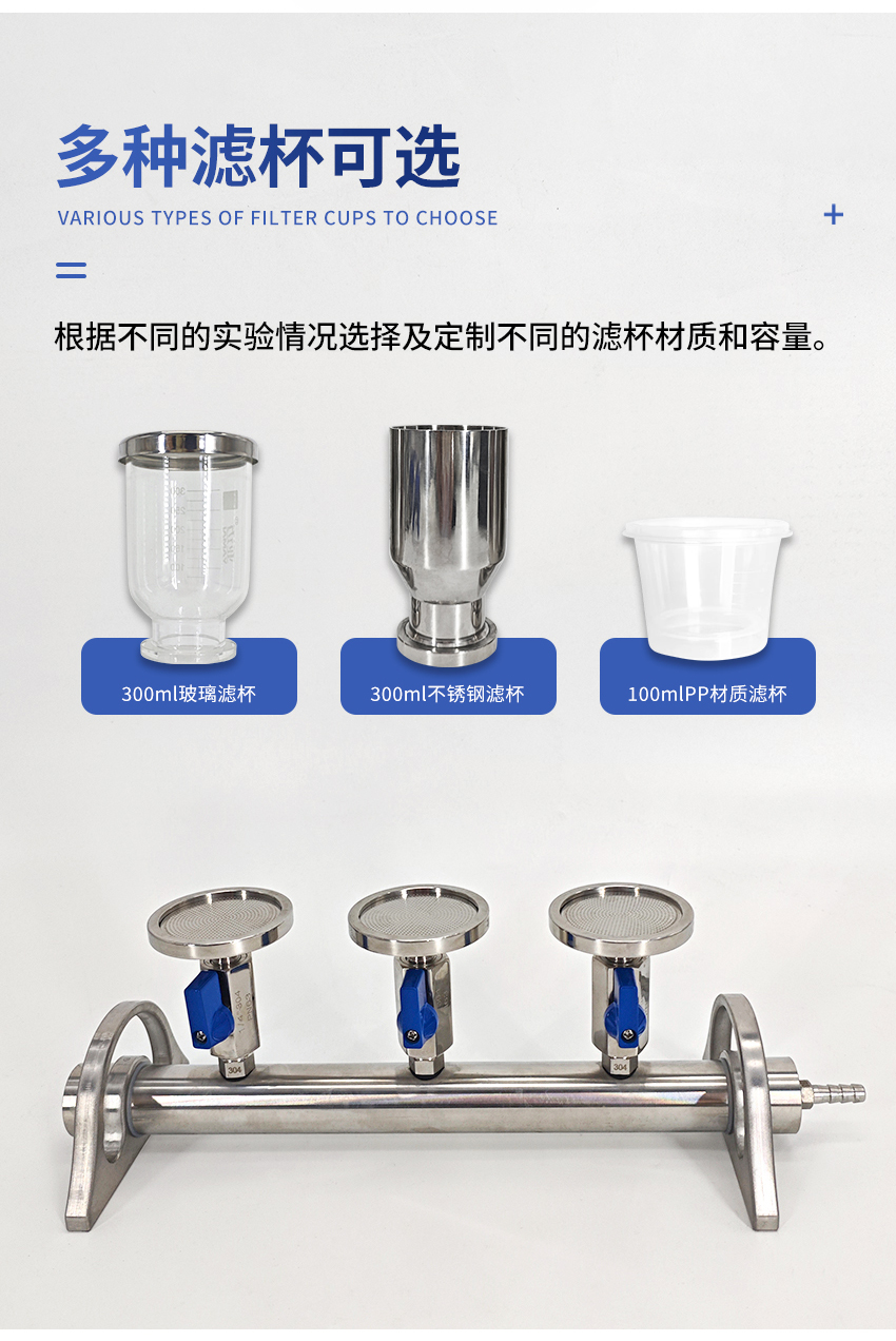 4. 靈活多樣的過(guò)濾頭選擇:過(guò)濾頭有單聯(lián)及多聯(lián)(二聯(lián)、三聯(lián)、四聯(lián)、六聯(lián)或其他聯(lián)數(shù)定制)可選。多聯(lián)可同時(shí)抽濾,提升工作效率;每個(gè)濾頭又能獨(dú)立控制,方便操作人員靈活運(yùn)用。