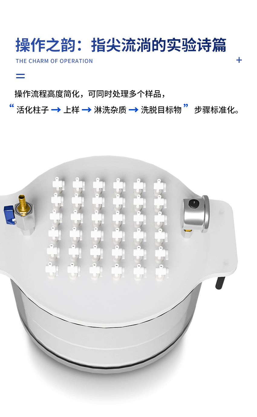 聚創 JC - GX - 36S 型固相萃取裝置,基于液固萃取與液相色譜技術融合發展而來。該裝置借助固體吸附劑,吸附液體樣品中的目標化合物,使其與樣品基體及干擾化合物相分離。隨后,通過洗脫液洗脫或加熱解吸附的方式,實現目標化合物的分離與富集,即達成樣品的分離、凈化和富集。其目的在于降低樣品基質干擾,提升檢測靈敏度,廣泛應用于各類食品安全檢測、農產品殘留監控、醫藥衛生、環境保護、商品檢驗、自來水及化工生產等實驗室場景。
