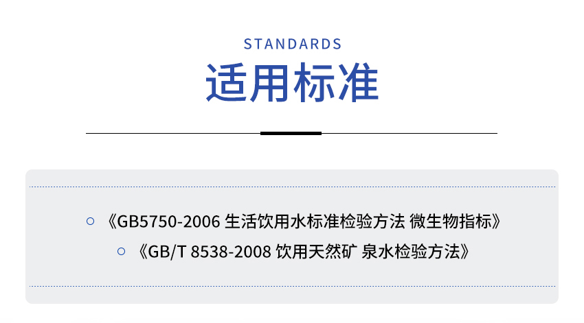 JC - W型儀器是用于對“包含少量微生物污染”水樣進行微生物檢測的新一代設備。它廣泛應用于環境監測,以及食品及飲料工業、化妝品和制藥工業的水中微生物質量控制領域。該儀器是遵照國家標準《GB5750 - 2006生活飲用水標準檢驗方法 微生物指標》和《GB/T 8538 - 2008飲用天然礦 泉水檢驗方法》進行水中微生物檢測的必備實驗器材。