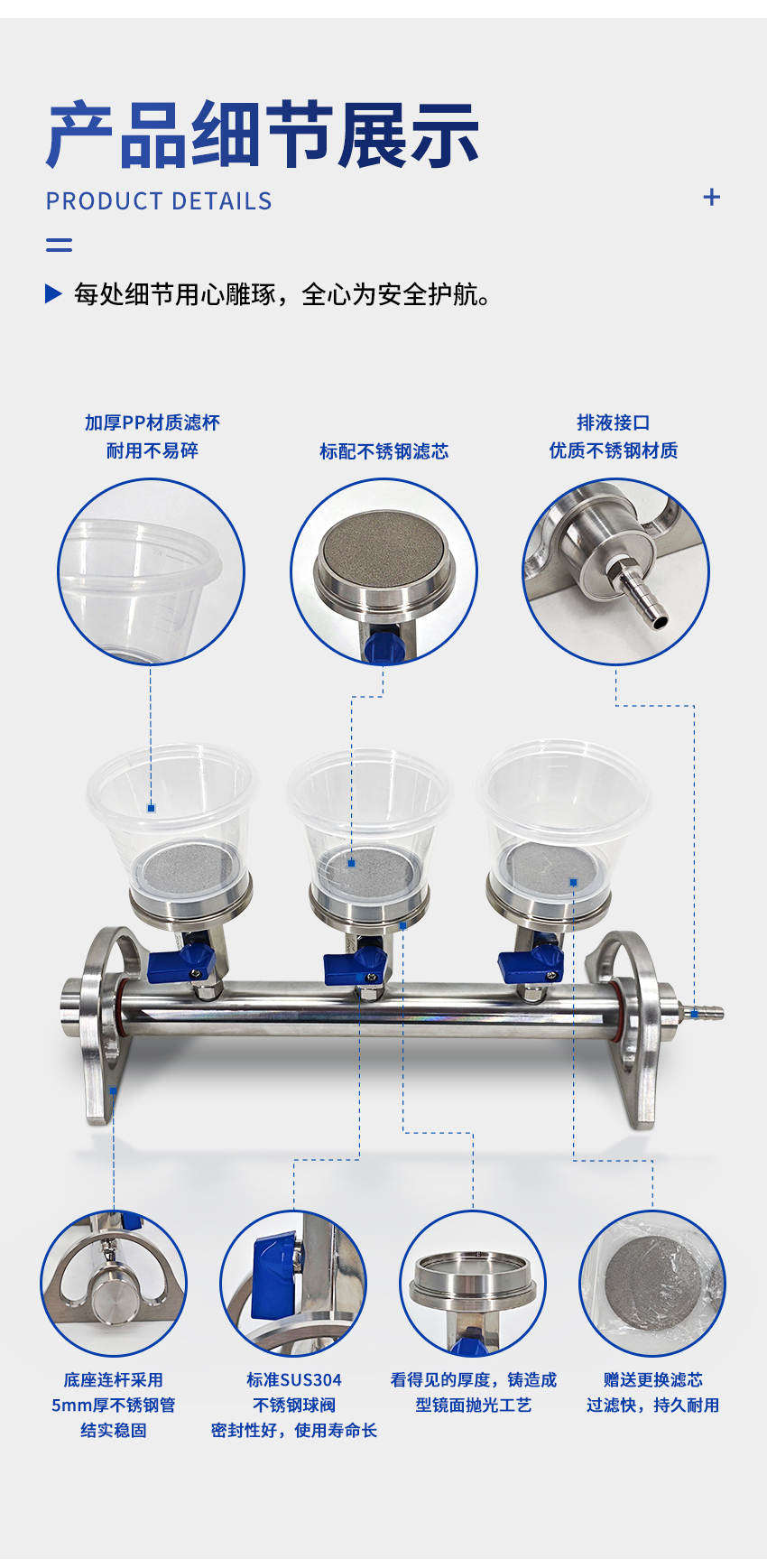 4. 過濾頭靈活多樣:過濾頭有單聯及多聯(三聯、六聯或其他聯數定制)可供選擇。多聯可同時抽濾,提升工作效率;每個濾頭還能獨立控制,便于操作人員靈活使用。