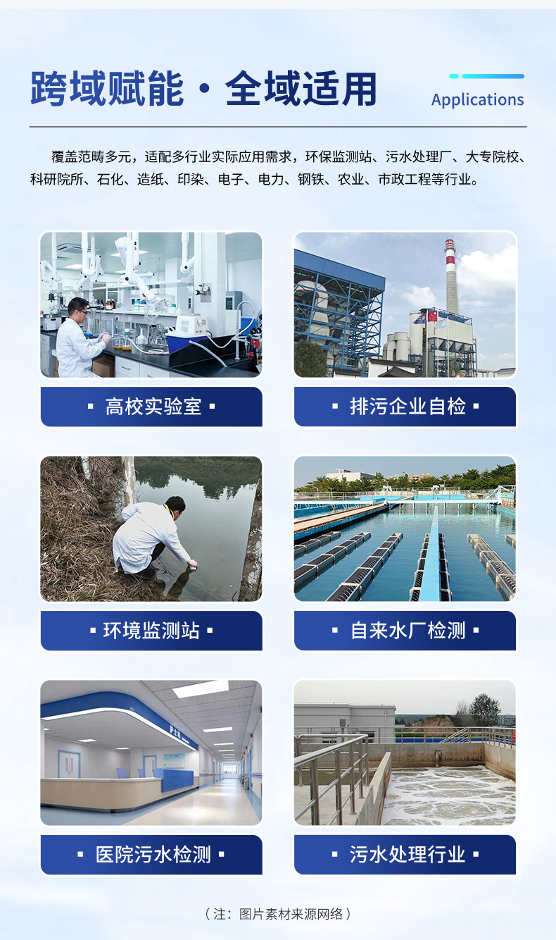 可廣泛應(yīng)用于環(huán)保監(jiān)測(cè)站、污水處理廠、大專(zhuān)院校、科研院所、石化、造紙、印染、電子、電力、鋼硫化物、農(nóng)業(yè)、市政工程等行業(yè)。